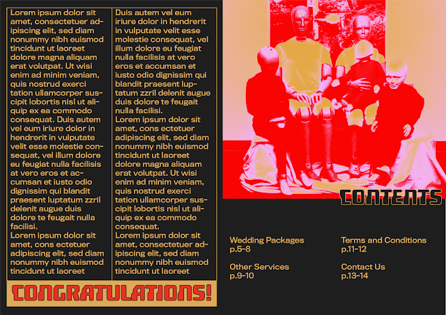 All in all, this design is quite successful in representing the Synthetic Hearts Wedding Chapel and what I’m trying to communicate through its design. The modular grid system, geometric shapes and symbols work really well in demonstrating a modern/futuristic aesthetic, and contrast the standard scripted type and curvy banners seen in wedding chapels today, giving it more of a robot feel. The colour palette works well, pink and red are classic colours associated with love and the gold just gives it an extra sense of class and sophistication. I also really like how the gradients work within the design. If I were to improve this design I would definitely change the typeface, it can still be something geometric and sans serif but just not something so gimmicky and obviously sci-fi. Also the image on the back cover doesn’t work well. Finally, while the black background makes the design a bit sleeker and possibly represents the ‘coldness’ of robots, I think maybe something brighter would work better. Throughout this design process, I need to not only represent robots, but also associate human processes/design sensibilities with this robotic design in order to maximise the impact.